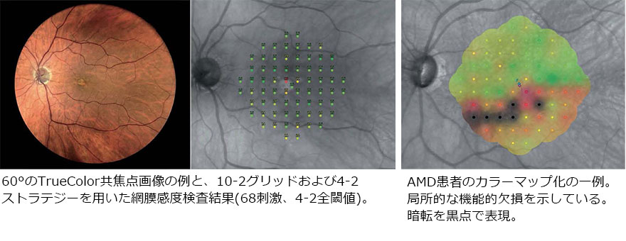 4段階固定の簡易ストラテジーおよび4-2全閾値ストラテジーによるマイクロペリメトリー検査と、機能の進行をモニタリングするフォローアップ検査が可能です。